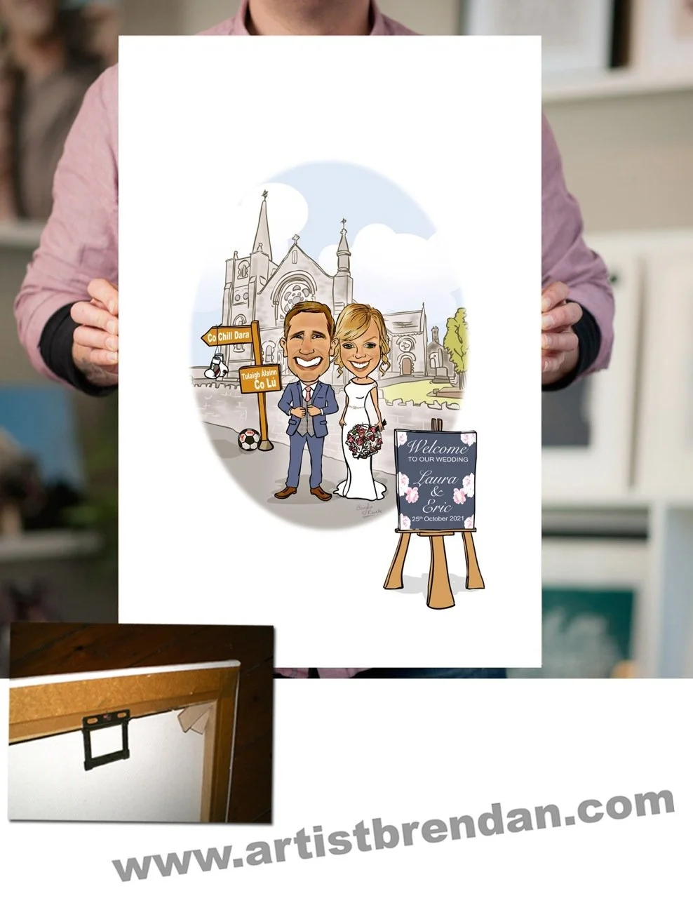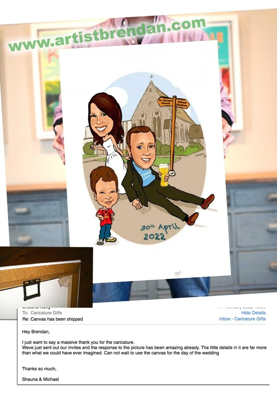 The cartoon can be of them outside the church or hotel, or if you have any other ideas to personalize it that’s even better.